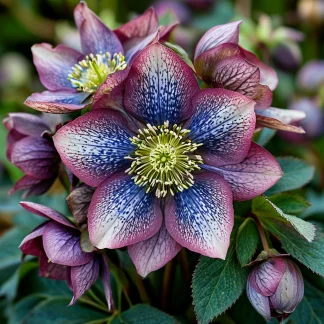 Морозник «Винтер Сонет» — настоящий шедевр зимнего цветения. Его изящные цветки, словно созданные из тончайшего фарфора, с белоснежными лепестками, украшенными нежными синими оттенками и элегантным фиолетовым обрамлением бутонов, создают атмосферу зимней сказки и наполняют сад волшебством. Представьте, как эти прекрасные цветы будут смотреться на фоне заснеженного ландшафта, радуя глаз и даря надежду на скорое наступление весны.